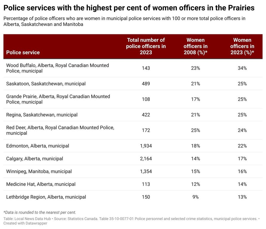 LOCAL NEWS DATA HUB – Women police officers remain significantly underrepresented in the largest police services across the Prairie provinces despite evidence suggesting they are often preferred by victims of domestic violence or sexual assault, are less likely to use force, and may be better at de-escalating tense situations.