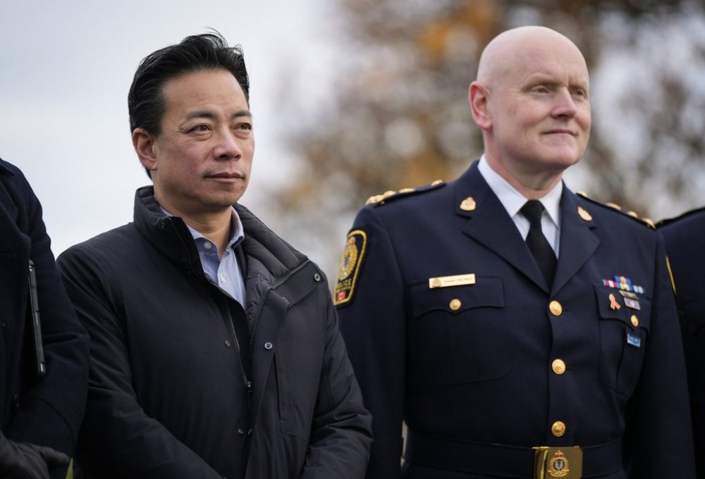 Vancouver Mayor Ken Sim, left, and Vancouver police Chief Adam Palmer listen as B.C. Premier David Eby announces a new public safety plan in Vancouver, on November 20, 2022. THE CANADIAN PRESS/Darryl Dyck