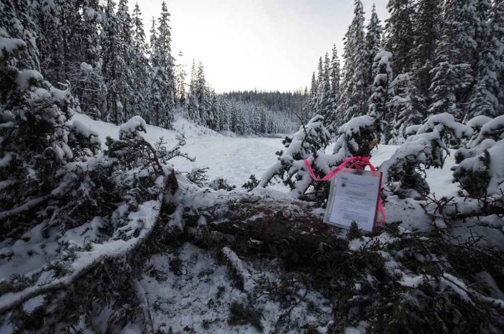 A notice to clear the road from RCMP sits in a tree fell across the roadblock access to Gidimt'en checkpoint near Houston B.C., on Wednesday Jan. 8, 2020. THE CANADIAN PRESS/Jason Franson