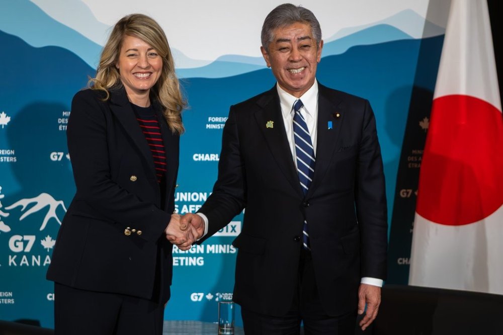 Foreign Affairs Minister Melanie Joly shakes hands with her Japanese counterpart Takeshi Iwaya before a bilateral meeting at the G7 Foreign Ministers Meeting (FMM) in La Malbaie, Que., Thursday, March 13, 2025. THE CANADIAN PRESS/Francis Vachon
