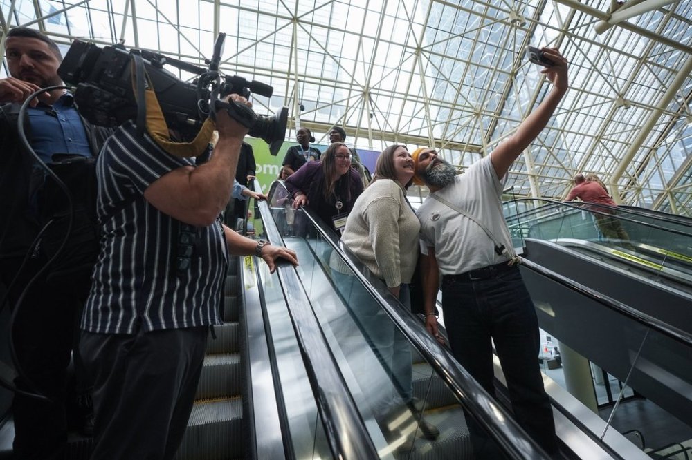 NDP Leader Jagmeet Singh poses for a selfie with delegates during a campaign stop at the Ontario Public Service Employees Union annual convention, in Toronto, Friday, April 25, 2025. THE CANADIAN PRESS/Darryl Dyck