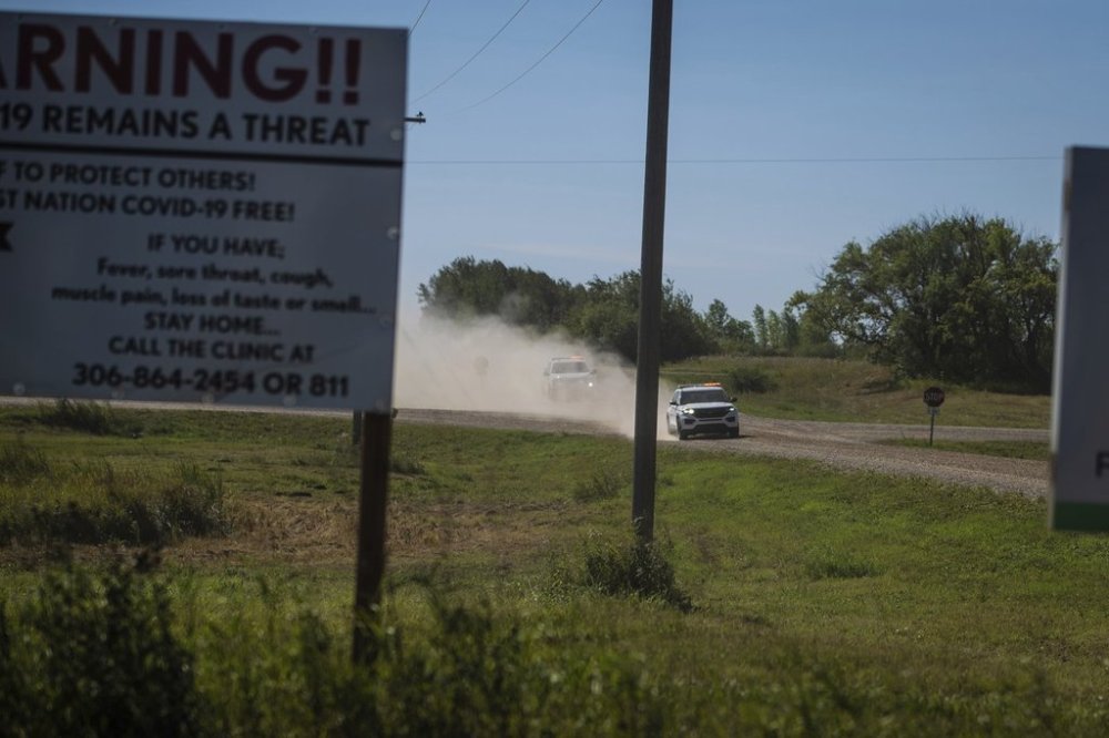 Canadian law enforcement personnel rush to a home on the James Smith Cree First Nation reservation in Saskatchewan, Tuesday, Sept. 6, 2022. THE CANADIAN PRESS/AP-Robert Bumsted