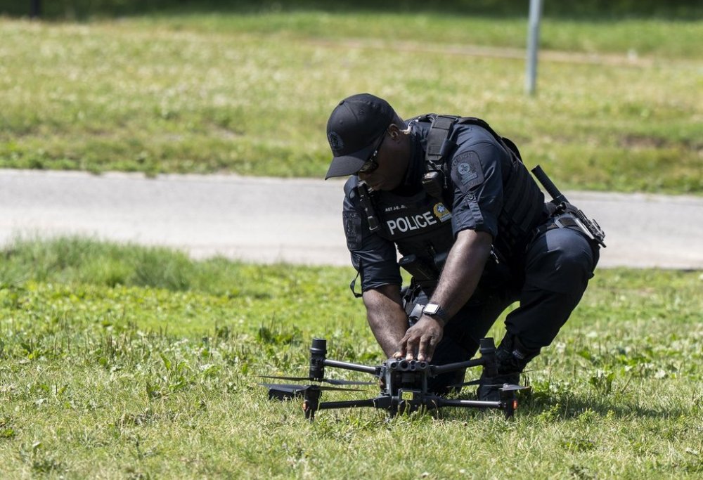 A police officer readies a drone as they search the St. Lawrence River for the body of a 32-year-old man who may have drowned at the Verdun Beach on Wednesday, July 16, 2025. THE CANADIAN PRESS/Christinne Muschi