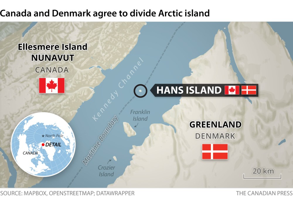 Northern Affairs Minister Dan Vandal said Canada and Denmark share a rich and co-operative history, and “it is fitting, and only a matter of time, that an equitable solution like this was reached, based on both practicality and compromise.”
