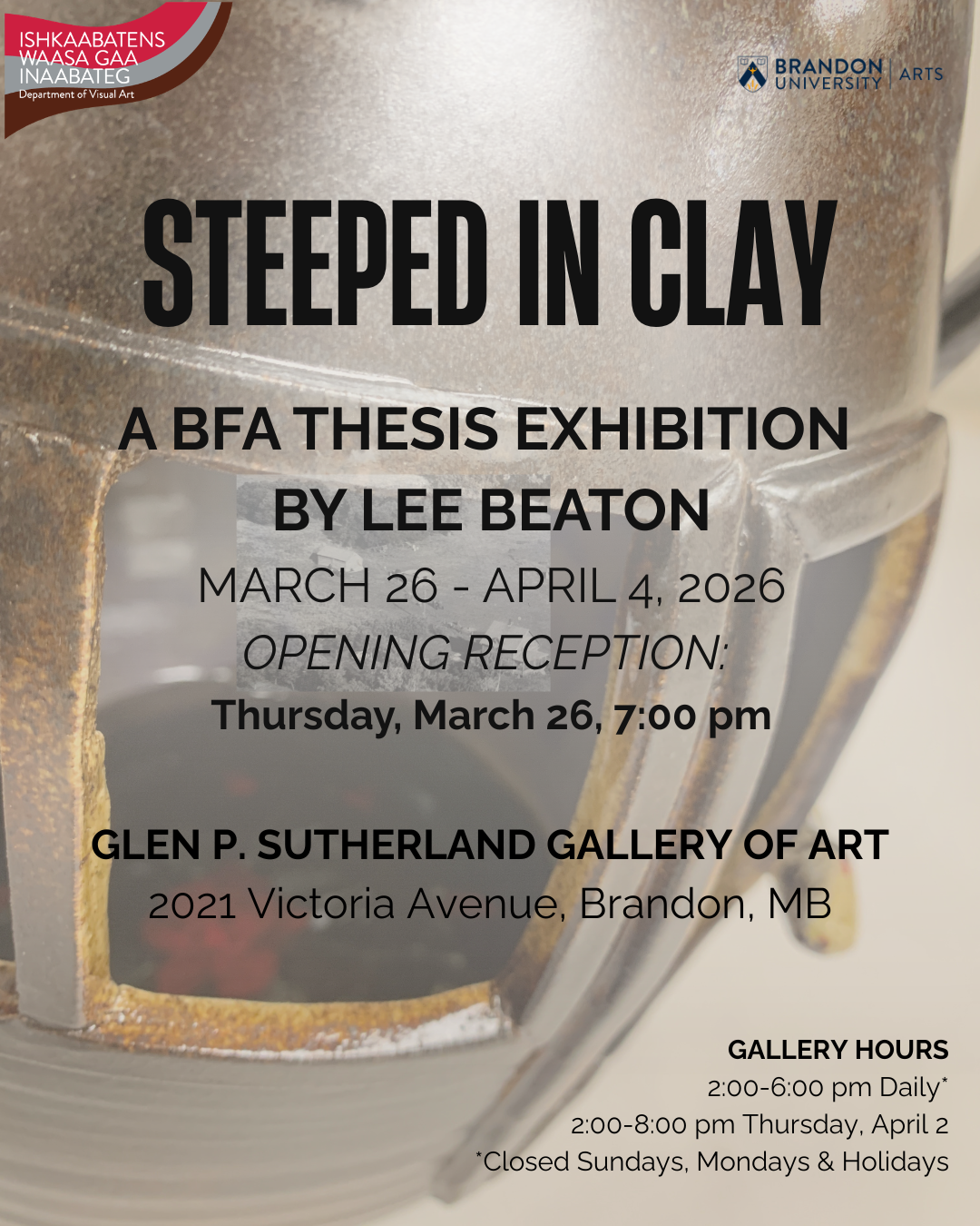 Steeped in Clay is a BFA Thesis Exhibition by Lee Beaton. March 26 to April 4, 2026 at the Glen P. Sutherland Gallery of Art in Brandon, MB. Located at […]
