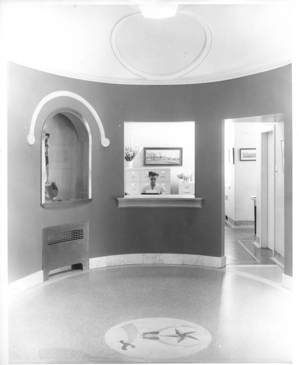 Walking inside the building today, the entrance foyer still looks much the same as the day it opened. An opening to the right still has the building’s receptionist, a display case is next to it, and on the other side is the door to offices.