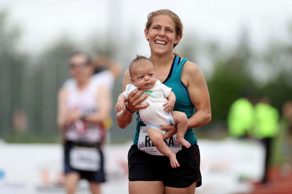 It took Dr. Reesa Simmonds an extra hour to run the full Manitoba Marathon this year but she had an excellent excuse. She gave birth to a baby boy 83 days ago and carried him over the finish line.