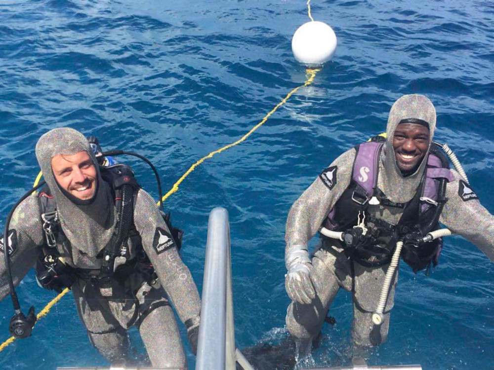After everybody was in the water, we started our descent holding on to the anchor line. Once I’m down to the sandy bottom, I look up to see Alex, a true gamer, doing all the things he had been taught just an hour ago to equalize the pressure in his ears, mostly plugging his nose and trying to gently blow it.