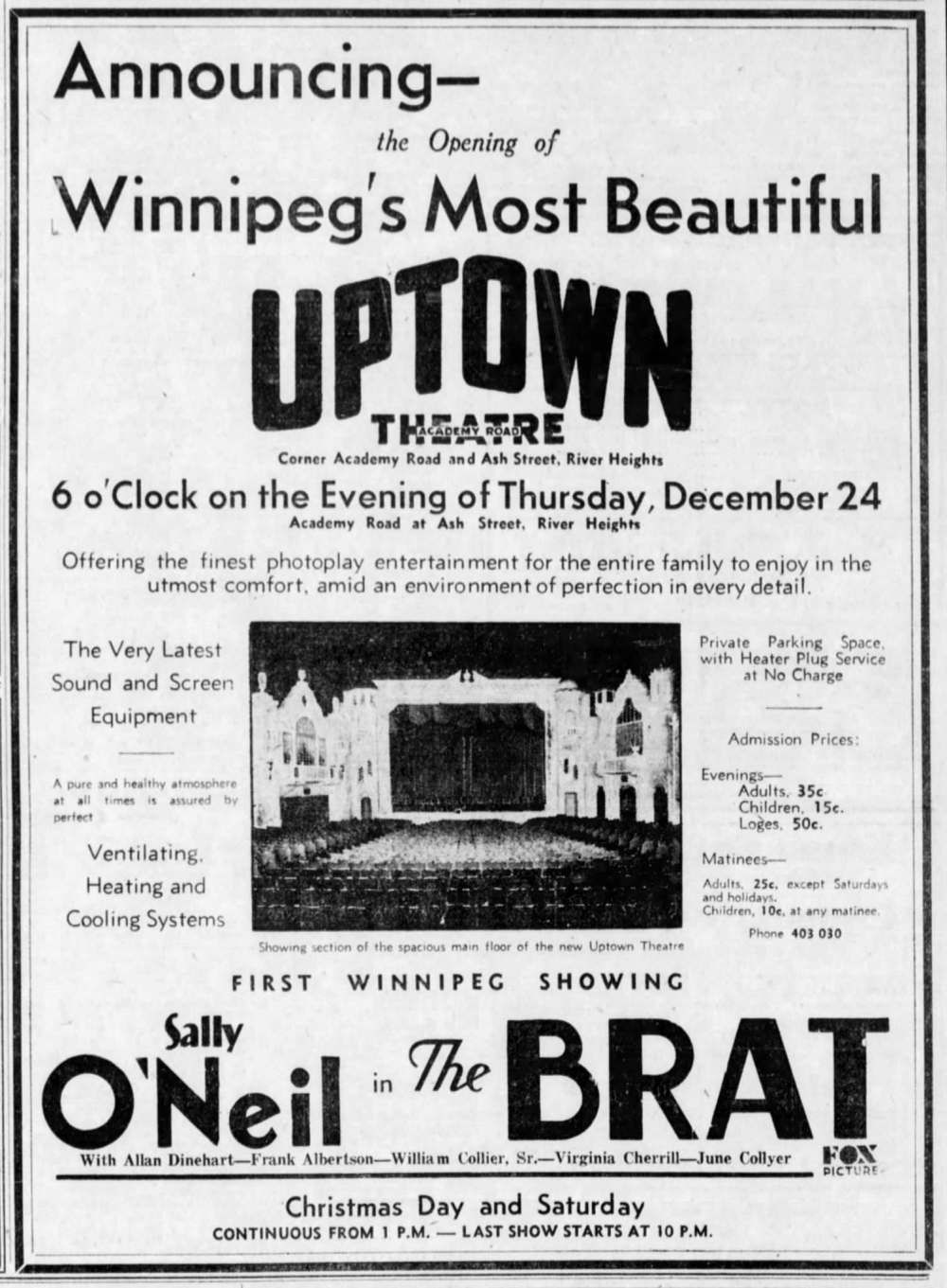 The Uptown Theatre was financed by Jack Miles’ Allied Amusements Ltd., which amassed a chain of neighbourhood theatres starting with the Palace on Selkirk Avenue in 1912, then the Rose on Sargent Avenue, the Plaza on Marion Street and the Roxy on Henderson Highway.