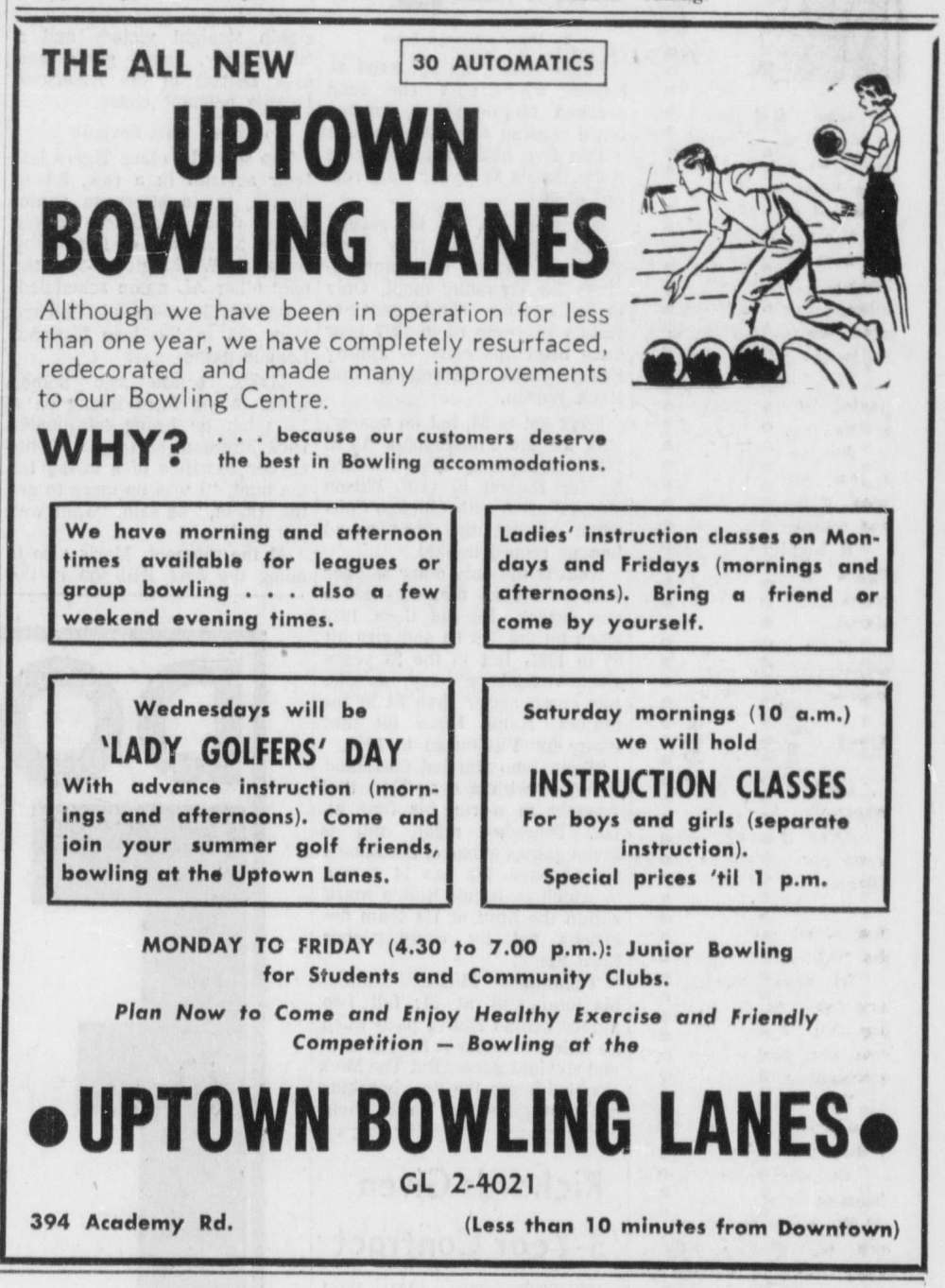 Uptown Bowling Lanes, Winnipeg’s largest, opened on Sept. 29, 1960. The next month, a formal opening ceremony took place featuring Cactus Jack Wells as MC and a fashion show of the latest bowling attire.