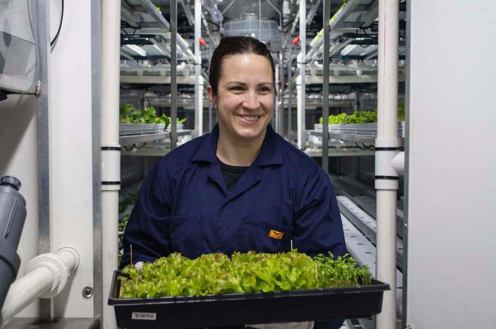 CHURCHILL — Carley Basler pulls apart a yellow sponge, from which two sprouting lettuce plants are dangling. She places each inside inch-square holes on a metal shelf, inside a humid, densely packed shipping container that sits on the tundra.