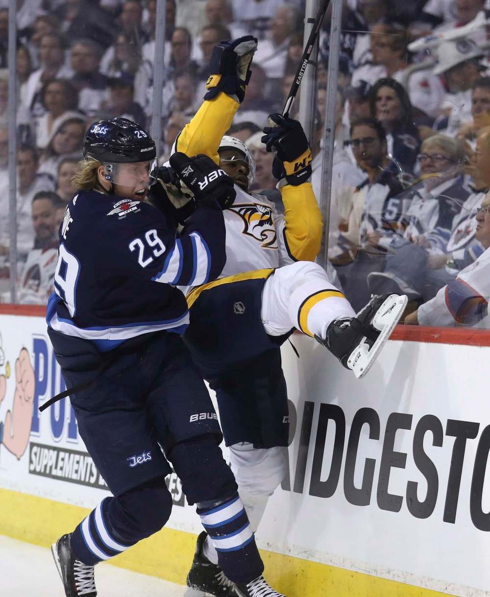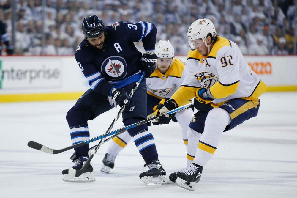 Winnipeg Jets' Dustin Byfuglien (33) gets the puck stolen by Nashville Predators' Viktor Arvidsson (33) and Ryan Johansen (92) during first period NHL round two game three playoff action in Winnipeg, Tuesday, May 1, 2018.Winnipeg Jets' Patrik Laine (29) hits Nashville Predators' P.K. Subban (76) during second period NHL hockey playoff action in Winnipeg on Tuesday May 1, 2018. THE CANADIAN PRESS/Trevor HaganJohn Woods/Winnipeg Free Press