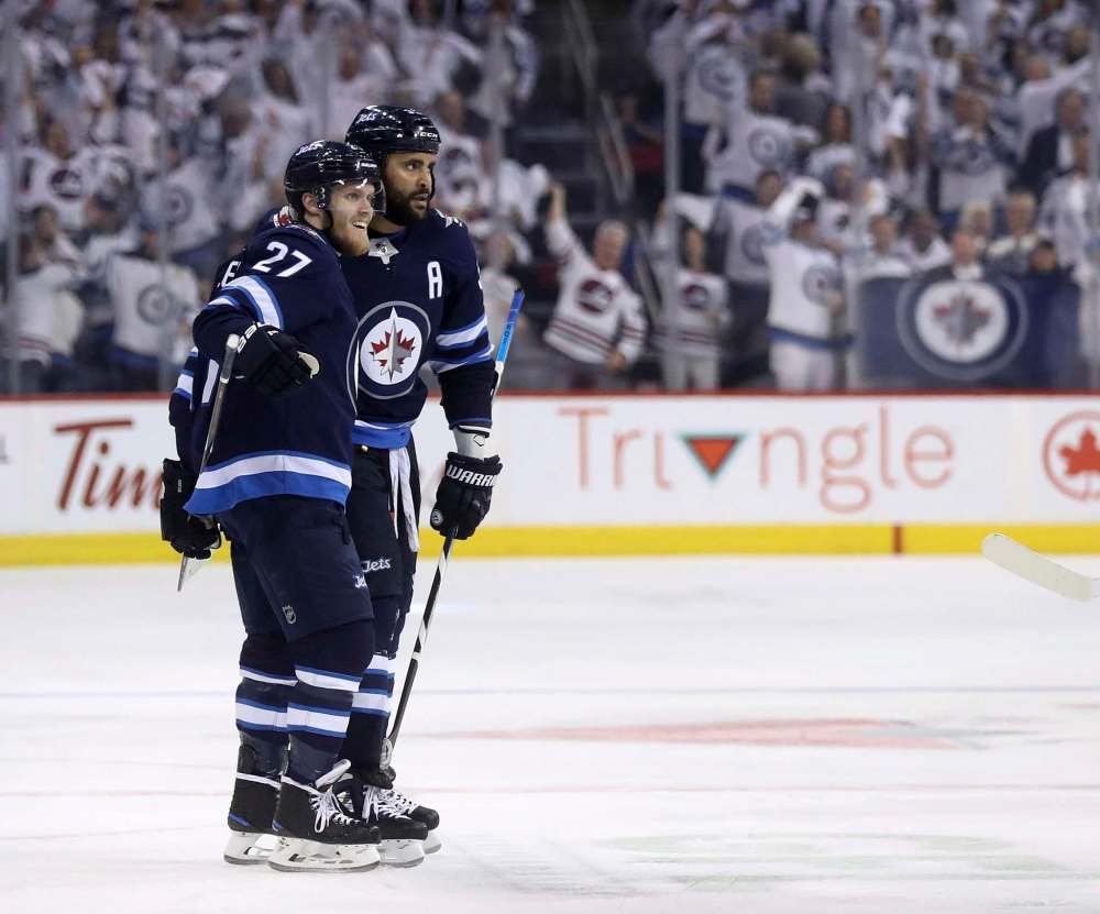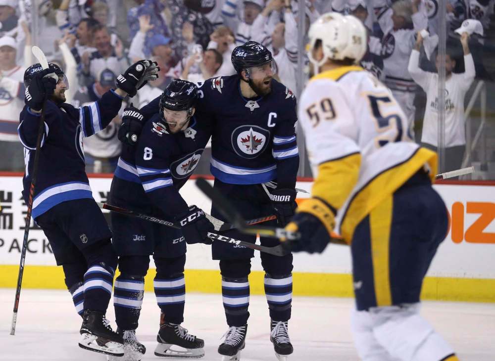 The Winnipeg Jets celebrate after Dustin Byfuglien (33) scored against the Nashville Predators during second period NHL hockey playoff action in Winnipeg, Tuesday, May 1, 2018. THE CANADIAN PRESS/Trevor HaganCP