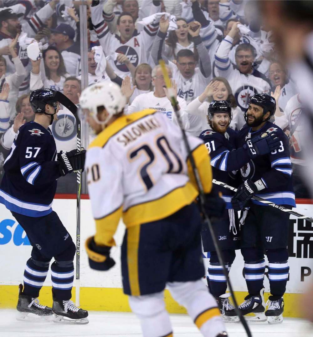 Nashville Predators' fans surrounded by cheering Winnipeg Jets' fans after Jets' Dustin Byfuglien (33) scores during second period NHL round two game three playoff action in Winnipeg, Tuesday, May 1, 2018.Winnipeg Jets' Josh Morrissey (44), Jacob Trouba (8) and Blake Wheeler (26) celebrate after Trouba scored against the Nashville Predators during second period NHL hockey playoff action in Winnipeg, Tuesday, May 1, 2018. THE CANADIAN PRESS/Trevor HaganCP