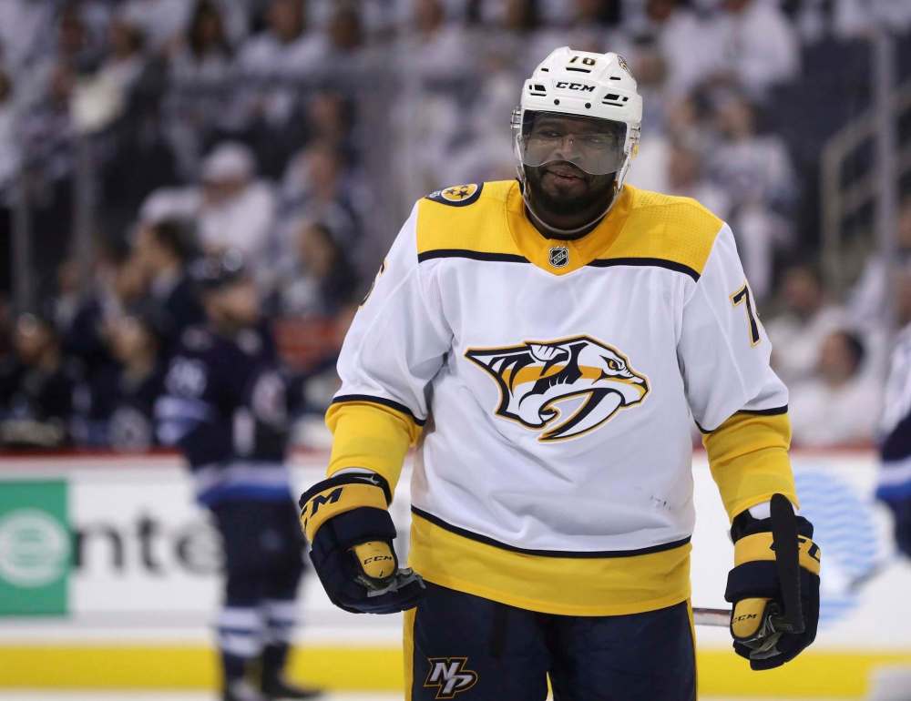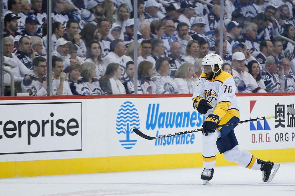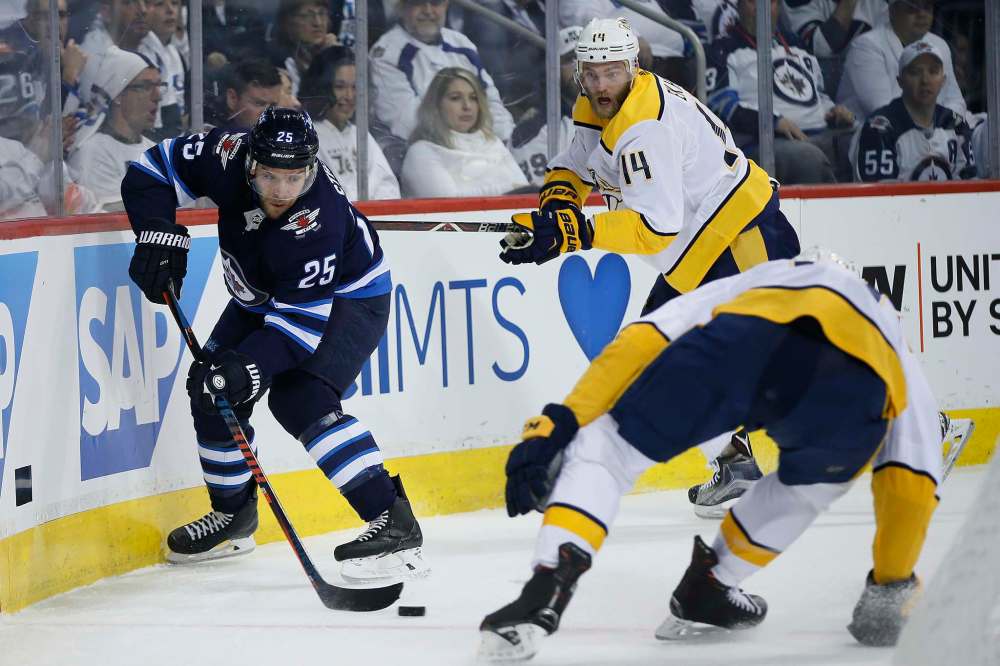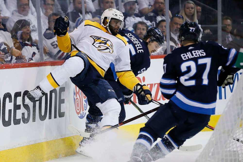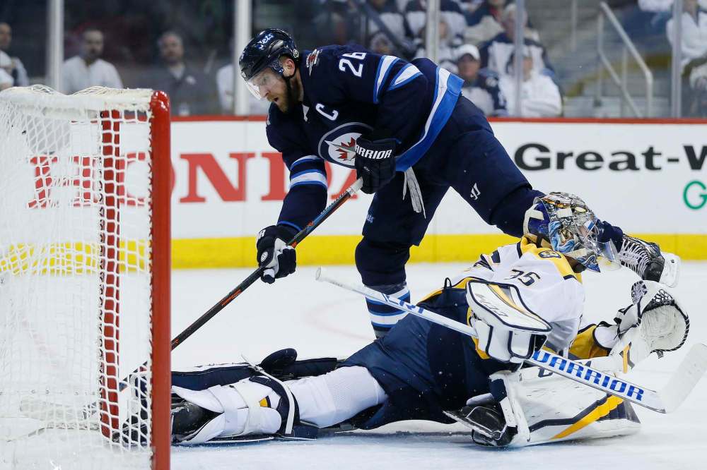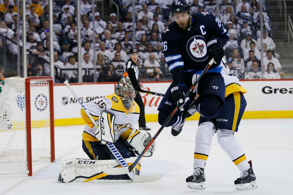 Winnipeg Jets' Blake Wheeler (26) can't get the puck past Nashville Predators goaltender Pekka Rinne (35) during first period NHL round two game three playoff action in Winnipeg, Tuesday, May 1, 2018.Nashville Predators' P.K. Subban (76) skates during a break in the action against the Winnipeg Jets in the second period of NHL hockey playoff action in Winnipeg, Tuesday, May 1, 2018. THE CANADIAN PRESS/Trevor HaganWinnipeg Jets' Nikolaj Ehlers (27) and Dustin Byfuglien (33) celebrating after Byfuglien scored against the Nashville Predators during second period NHL hockey playoff action in Winnipeg, Tuesday, May 1, 2018. THE CANADIAN PRESS/Trevor HaganWinnipeg Jets' Tyler Myers (57), Kyle Connor (81) and Dustin Byfuglien (33) celebrate after Byfuglien scored against the Nashville Predators' during second period NHL hockey playoff action in Winnipeg on Tuesday, May 1, 2018. THE CANADIAN PRESS/Trevor HaganJohn Woods/Winnipeg Free Press