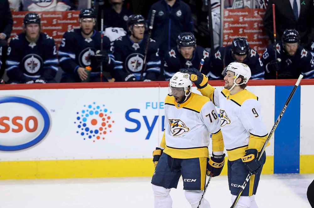 Nashville Predators' P.K. Subban (76) and Filip Forsberg (9) celebrate Subban's goal against the Winnipeg Jets during first period NHL round two game three playoff action in Winnipeg, Tuesday, May 1, 2018.Nashville Predators' Austin Watson (51) celebrates in front of the Jets bench after scoring during first period NHL hockey action in Winnipeg, Tuesday May 1, 2018. THE CANADIAN PRESS/Trevor HaganJohn Woods/Winnipeg Free Press