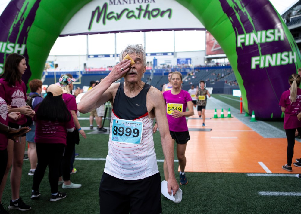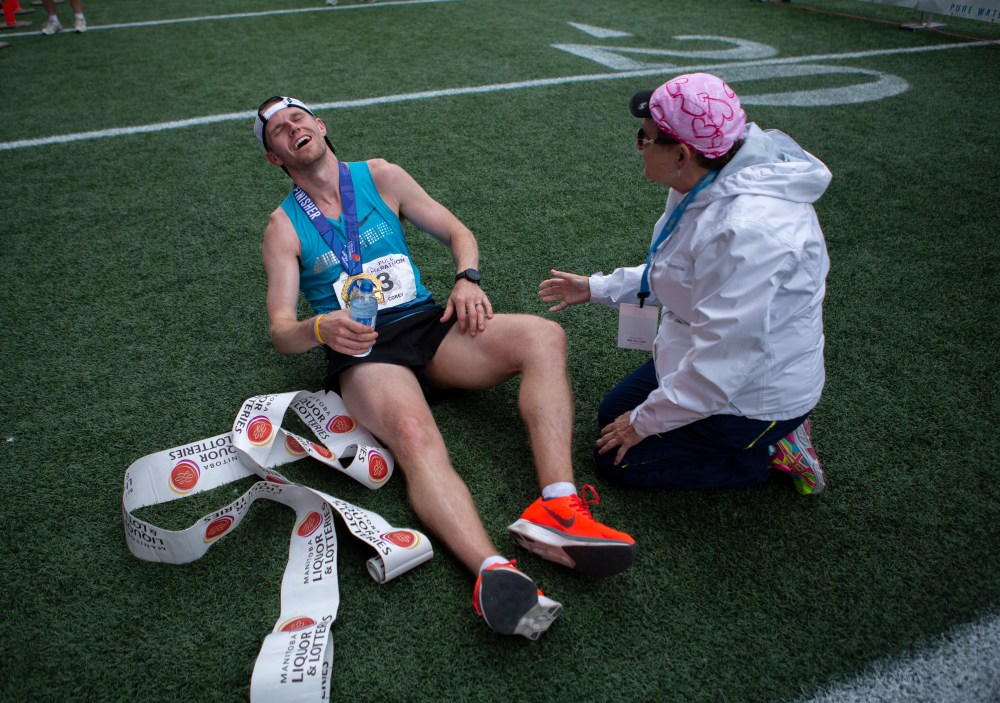 Winnipeg native Corey Gallagher won the men’s full marathon at the 40th annual Manitoba Marathon Sunday, as he crossed the finish line at Investors Group Field at 2:37:48.5.