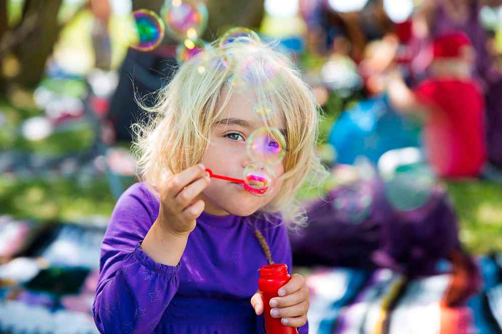 Three-year-old Piper MacDonald blows bubbles at the Winnipeg Folk Festival in Birds Hill Provincial Park Friday, July 6, 2018.ANDREW RYAN / WINNIPEG FREE PRESS