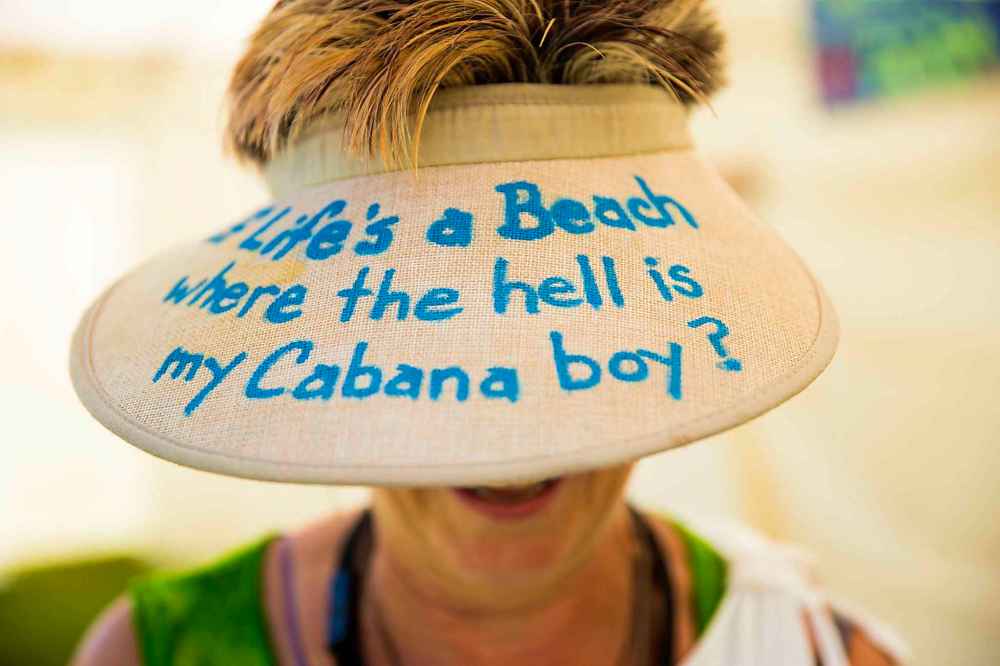 Donna Mills wears her irreverent spirit on her sun visor. Mills is a volunteer at the InfOasis, at the information point's tent at the Winnipeg Folk Festival in Birds Hill Provincial Park on Friday, July 6, 2018.ANDREW RYAN / WINNIPEG FREE PRESS