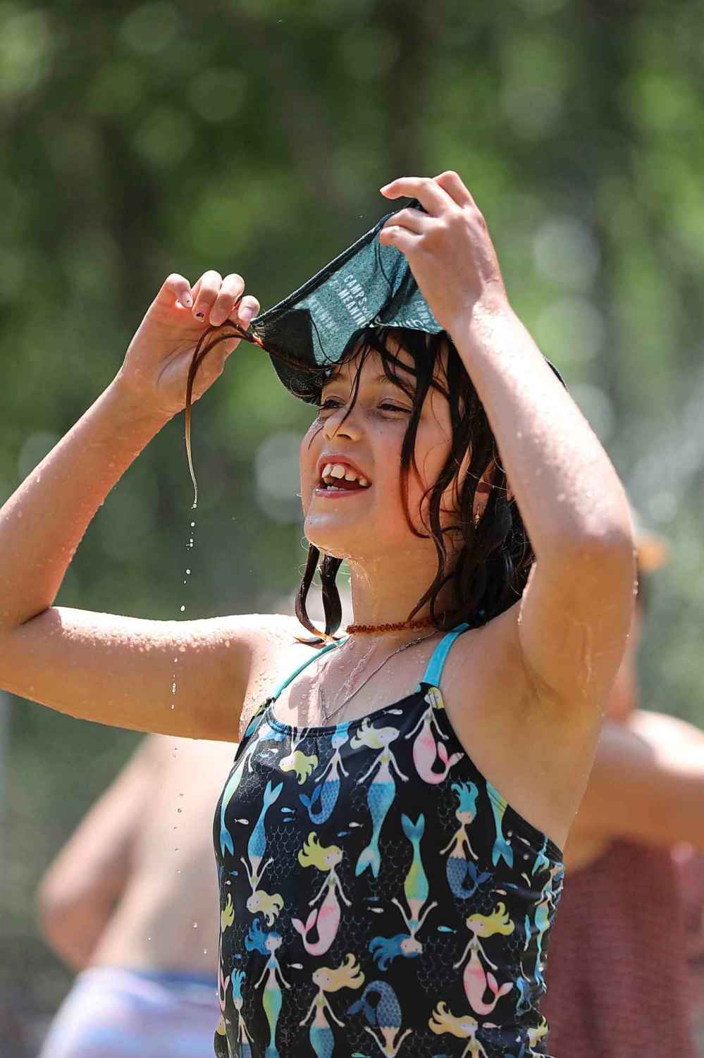 Ella Kowlowsky-Wiebe refreshes herself in the outdoor showers by soaking a cloth on her head while attending the Winnipeg Folk Festival with her family at Birds Hill Provincial Park Saturday, July 7, 2018.MIKAELA MACKENZIE / WINNIPEG FREE PRESS