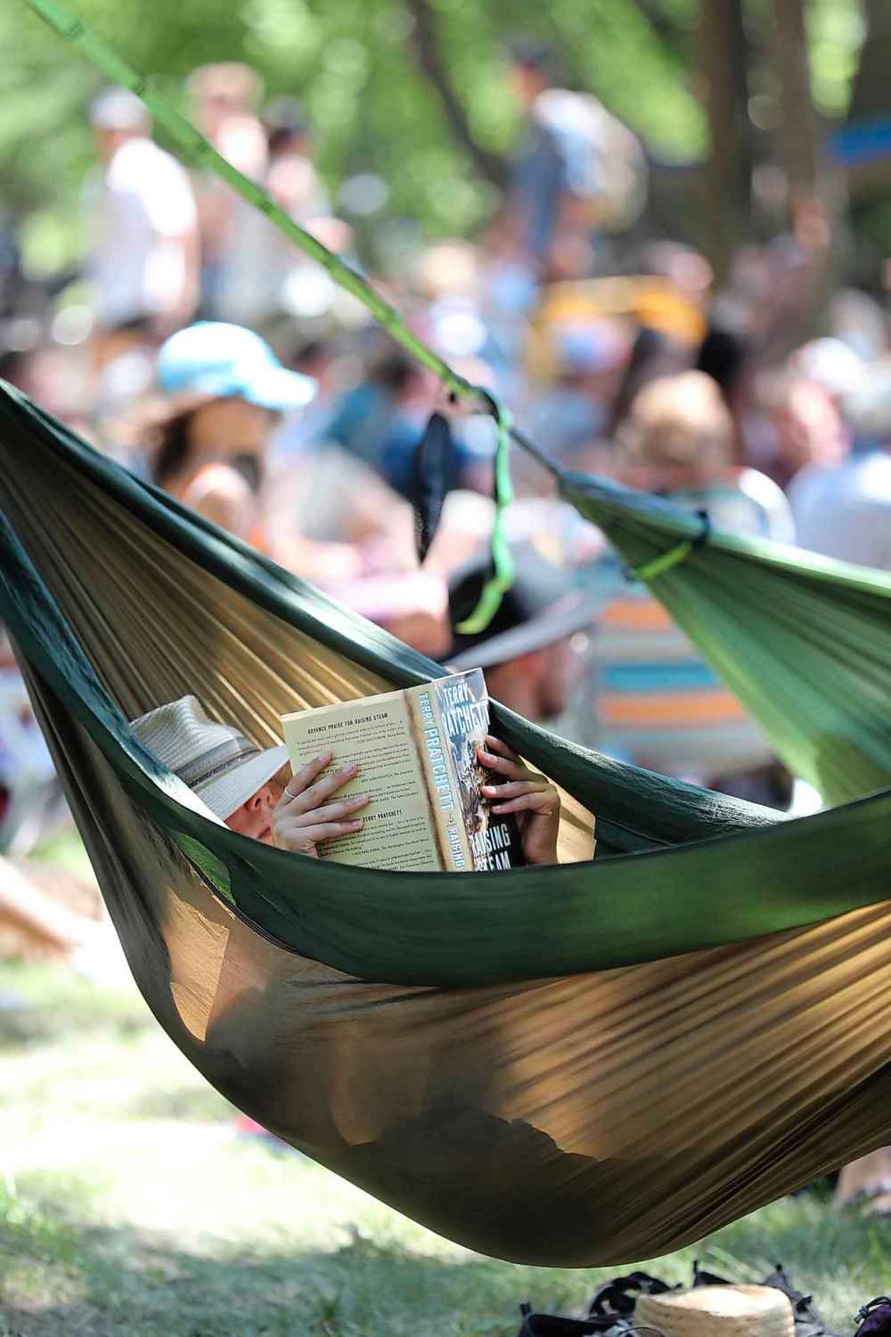 People lay in hammocks reading under clusters of trees to keep cool while attending the Winnipeg Folk Festival at Birds Hill Provincial Park Saturday, July 7, 2018.RUTH BONNEVILLE / WINNIPEG FREE PRESS