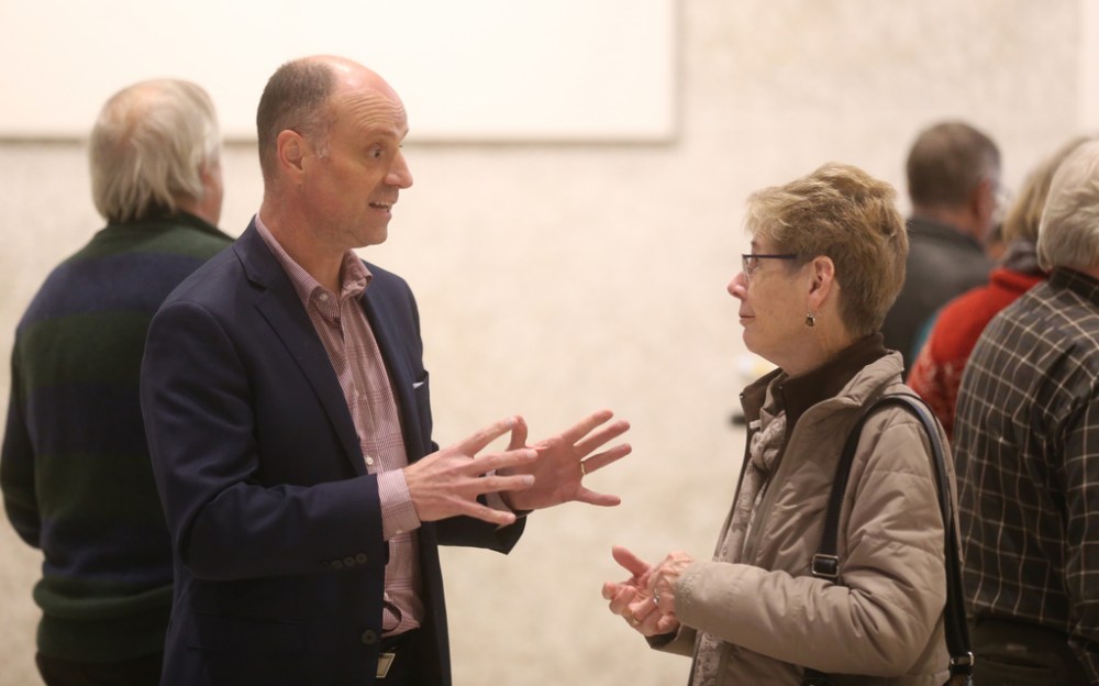 TREVOR HAGAN / WINNIPEG FREE PRESS Winnipeg Free Press editor Paul Samyn speaks with attendees to the Free Press showing of Spotlight at the Winnipeg Art Gallery, Wednesday evening.