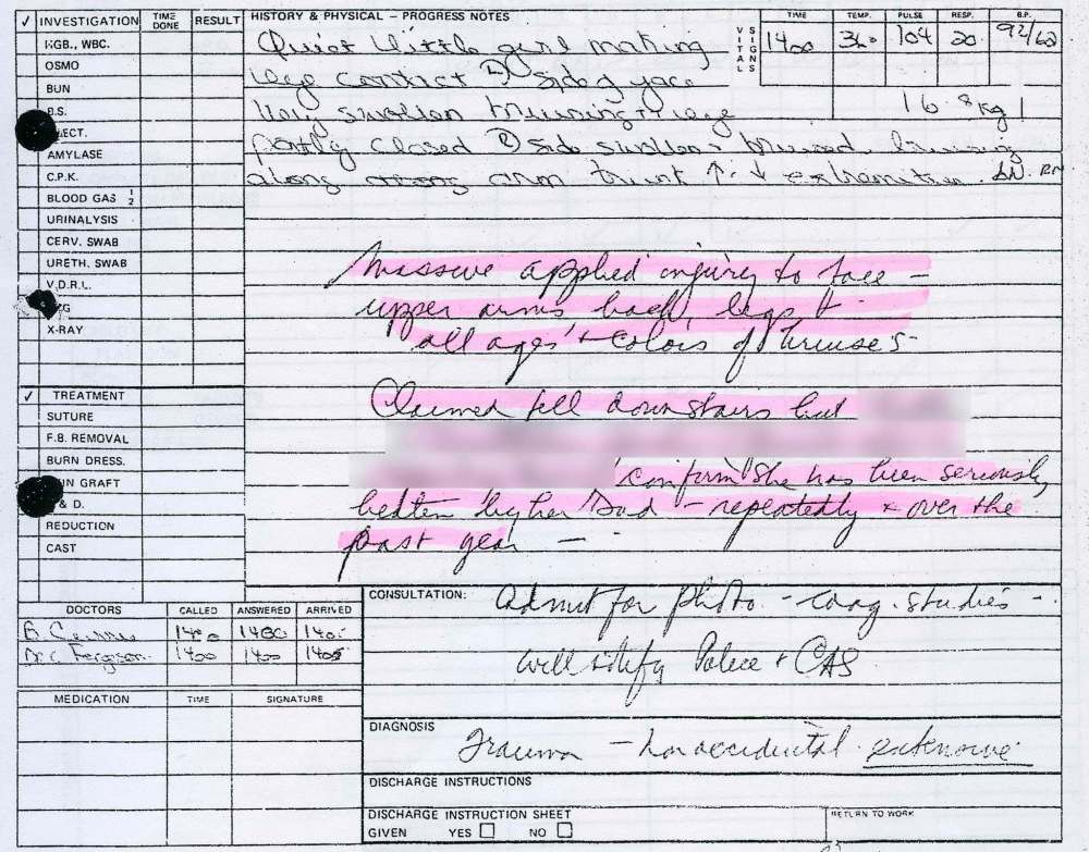 On one late summer day in 1981, a woman takes a little girl to the Children’s Hospital. She is four years old, tiny for her age, and both her eyes are ringed by swollen black and purple bruises. The woman, who is not the girl’s mother, tells a doctor that the child’s father had beaten her with a belt and his hands.