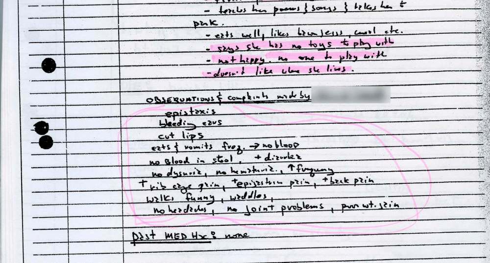 When she got the file home, she flipped through its pages, almost in shock. There, in her hands, was a complete record of the initial response to her abuse. Diagrams of her injuries. Notes from doctors and social workers describing what Payton and a witness had told them about the psychological and physical torment she’d suffered.