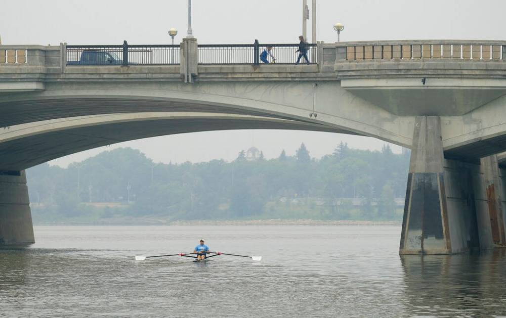 MIKE DEAL / WINNIPEG FREE PRESS Vic Bartel a member of the Winnipeg Rowing Club goes for a light row to on a July morning on the Red River despite the haze of smoke. Intense training has been reduced as the smoke from forest fires in northwestern Ontario and east-central Manitoba can cause health problems.