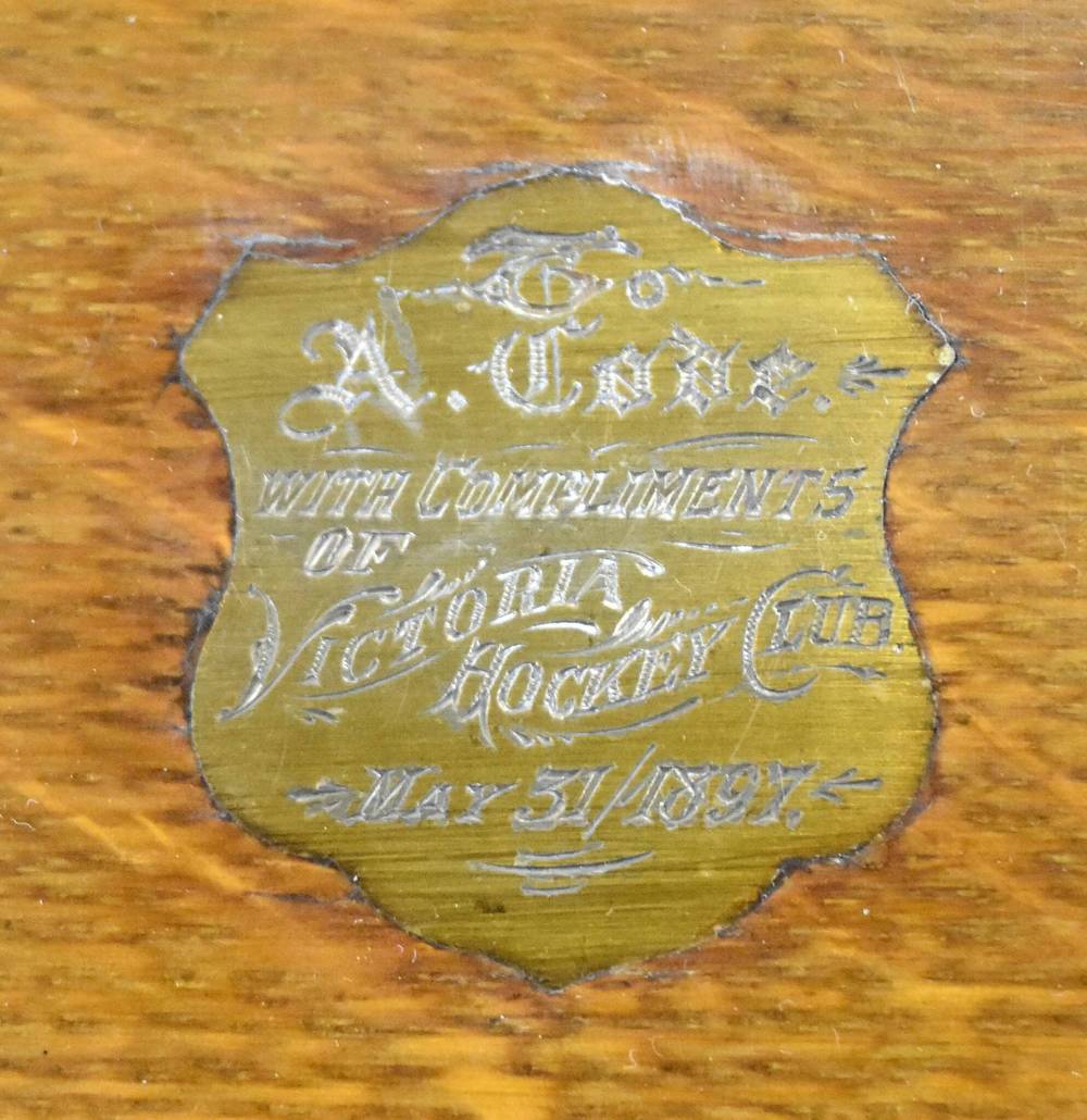 Dedication plate. Wedding gift of walnut wood silverware box to Abraham Code on May 31, 1897 by the Victoria Hockey Club of Winnipeg. Code was the vice president of the team as well as secretary treasurer of the Manitoba and North West Hockey Association.
