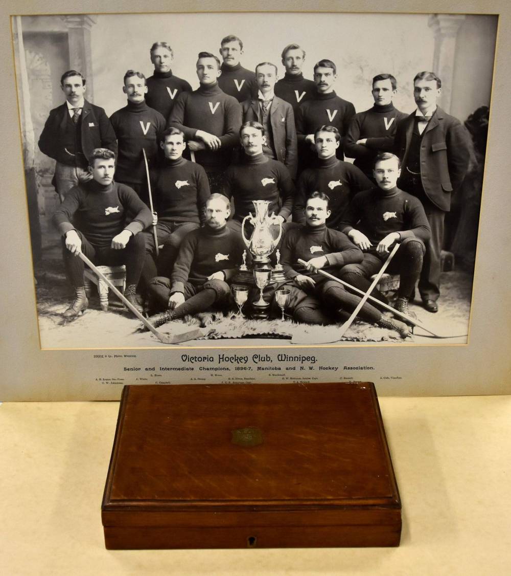 Wedding gift of walnut wood silverware box to Abraham Code on May 31, 1897 by the Victoria Hockey Club of Winnipeg. Backdrop is a team photo of the Intermediate and Senior Victorias Hockey Clubs for 1897.