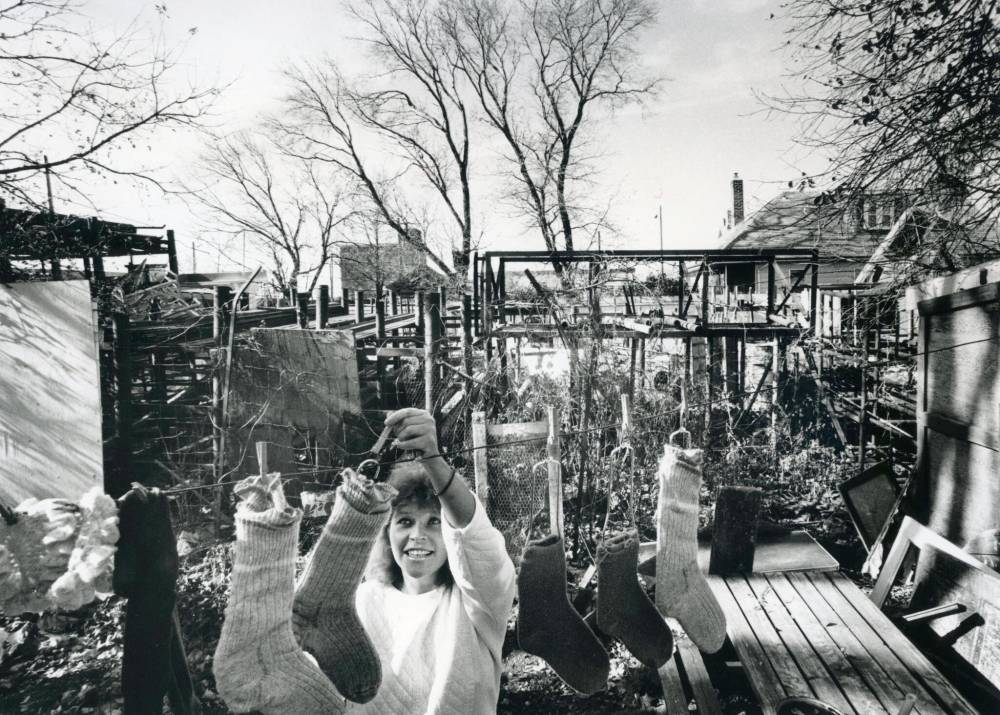GERRY CAIRNS / WINNIPEG FREE PRESS files Terry Bigularski hangs out the washing at her home next to Western Scrap Metals in 1987.