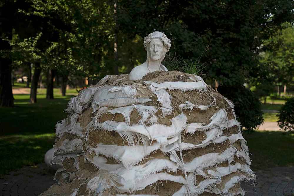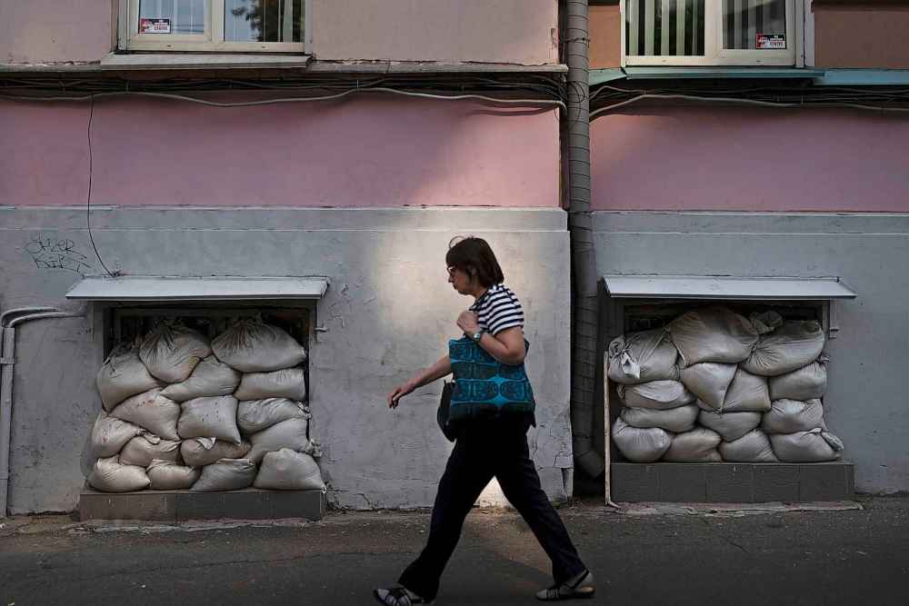 Numerous buildings across Kyiv bear the scars of Russian bombardment. Sandbags are stacked around monuments, museums and office buildings to protect from possible attack. At nights, streets are empty after the midnight curfew comes into force.