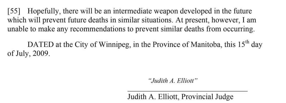 In his report into the 2007 fatal shooting of Roy Bell by a Winnipeg police officer, Judge Dale Schille criticized the 10-year delay for the inquest to take place and wrote the “primary goal” of any inquest is to generate recommendations that might help prevent future deaths.