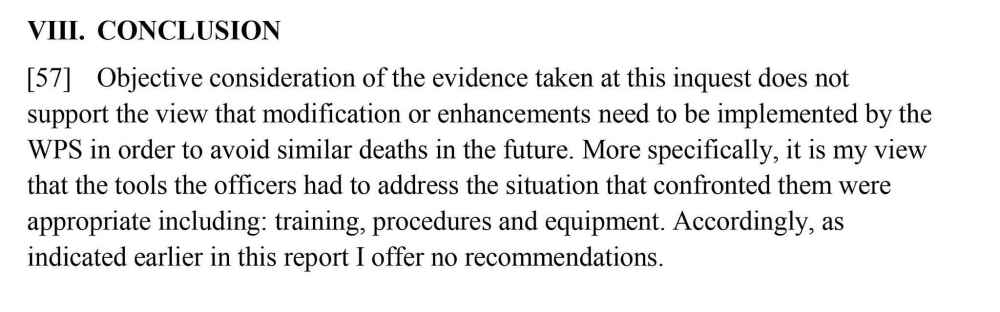 “Police shoulder substantial responsibility to the benefit of society. It is important they have access to the resources, human and otherwise, to realistically and safely meet their obligations,” Hewitt-Michta wrote, but added: “Recommendations about staffing ratios have political and economic consequences and are well beyond the scope of this Inquest.”