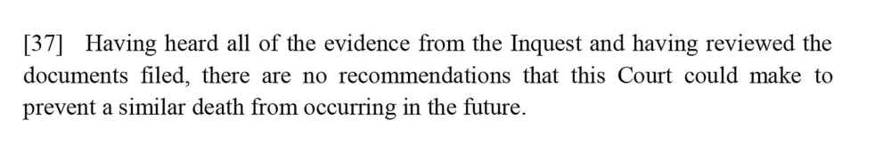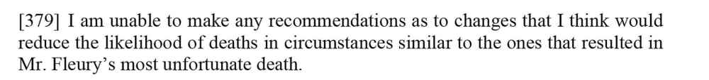 In that inquest, Judge Anne Krahn made 16 recommendations. Several were framed as calls for the province to “consider” certain policy changes. It meant they could be considered fulfilled after a degree of study, even if the province rejected the actual change.