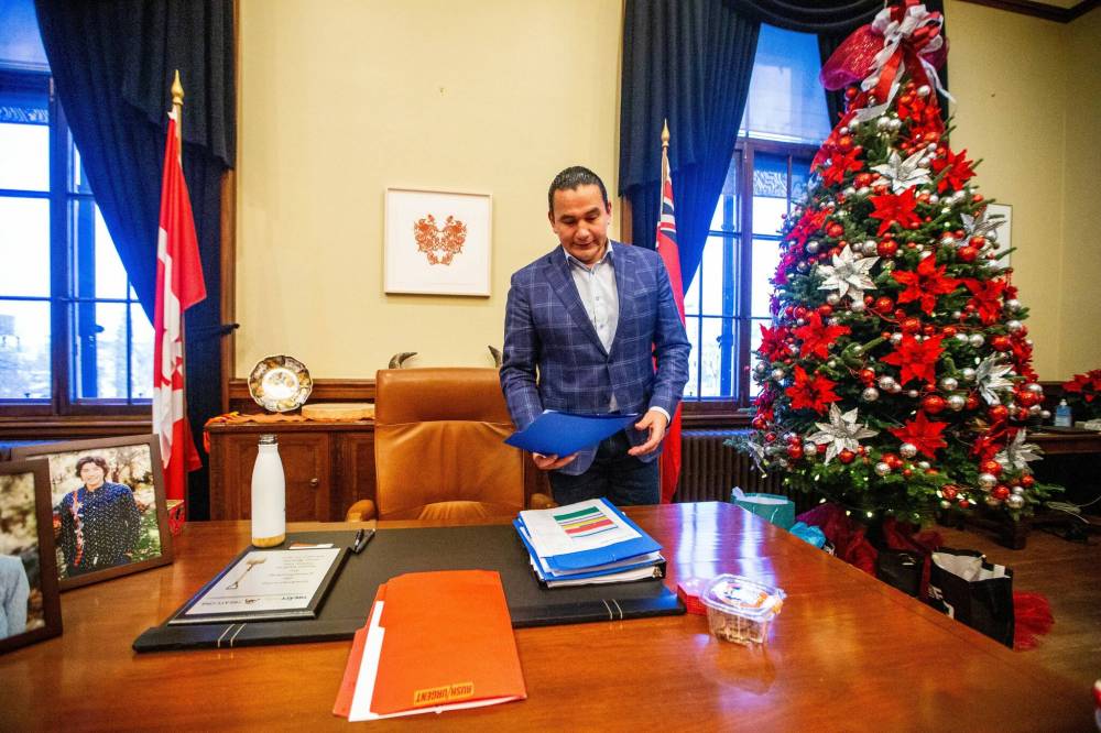 It’s a quieter-than-usual morning, since his five-year-old son slept over at his grandmother’s (Kinew’s mom, who often helps with child care) because the premier and his wife, Dr. Lisa Monkman, hosted the NDP caucus’s annual holiday party at their home the night before.