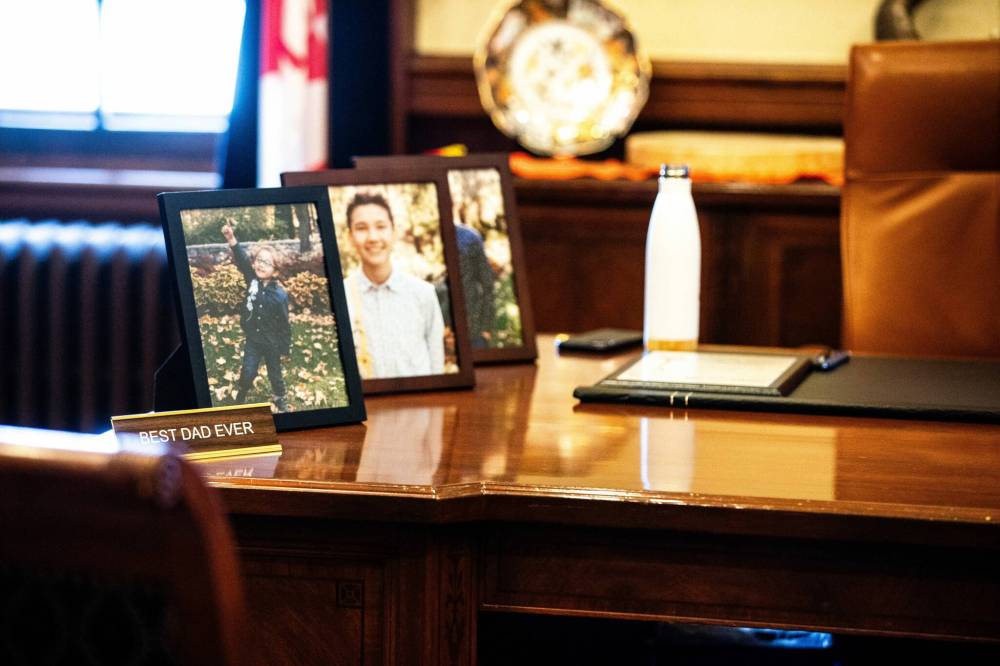 There are three photos on his desk, one of each son, along with a name plate bearing the words, “BEST DAD EVER.”