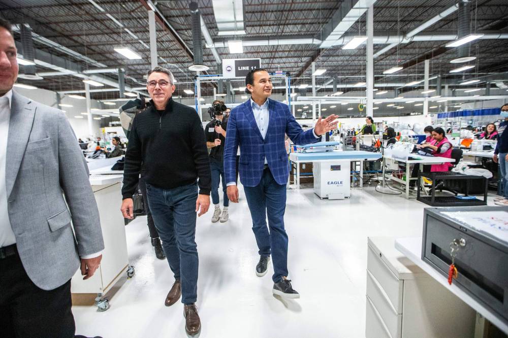 Wab Kinew takes a tour of the Canada Goose factory with COO John Moran. (Mikaela MacKenzie / Winnipeg Free Press)