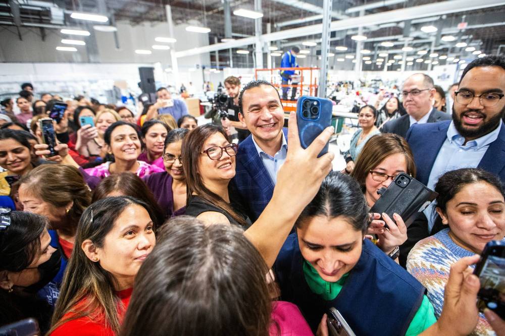 Wab Kinew takes selfies with employees during a tour of the Canada Goose factory. (Mikaela MacKenzie / Winnipeg Free Press)