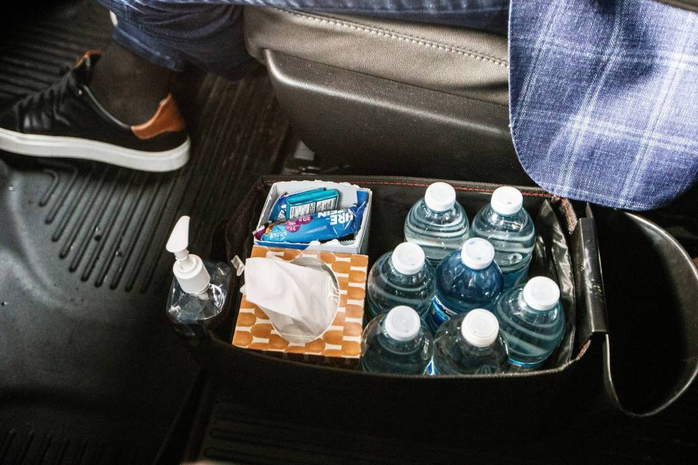 On-the-road essentials, including hand sanitizer and protein bars, in the RCMP car for Wab Kinew. (Mikaela MacKenzie / Winnipeg Free Press)
