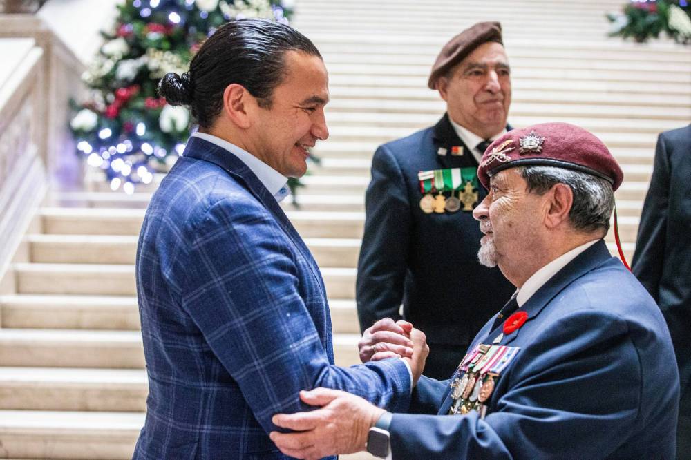 Wab Kinew greets Portuguese war veteran Pedro Correia at the Manitoba Legislative Building. (Mikaela MacKenzie / Winnipeg Free Press)