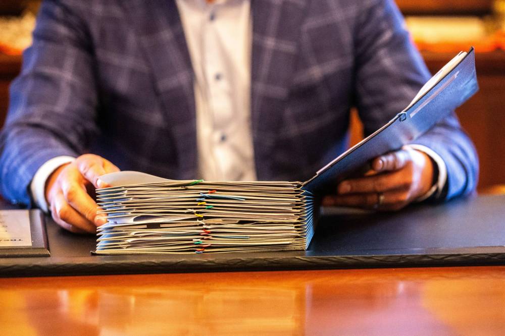 Wab Kinew looks at folders laid out on his desk first thing at his office. (Mikaela MacKenzie / Winnipeg Free Press)
