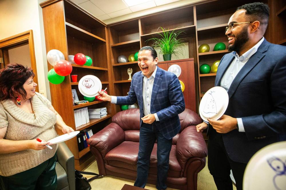 1:29 p.m. Kinew’s inner circle of staffers gets together in his office for an informal end-of-year celebration. He gifts each of his colleagues a colourful Yeti cooler.