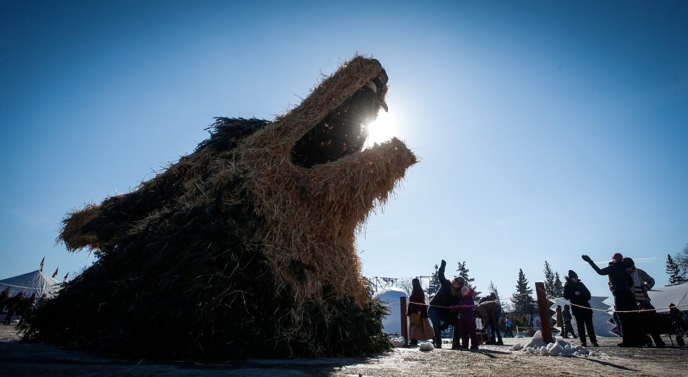 Because the winter weather hasn’t yielded much snow, the festival swapped some snow sculptures for ones made of mixed natural materials, including hay and wood. The children’s playground also swapped its usual ice blocks for ones made from woven materials to offer the same element of play.