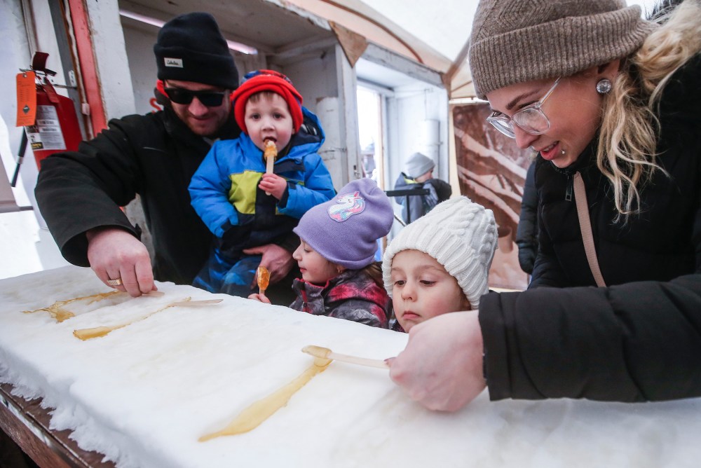 Claire Harvey and Meg Lovett waited patiently for their maple taffy to harden on a bed of snow inside the Cabane a Sucre tent — known as the sugar shack to anglophones.