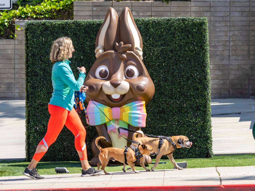 A woman walks her dog past a large chocolate rabbit in front of a candy store in Corona del Mar, Calif., on March 21. (Mark Rightmire/ Orange County Register via The Associated Press files)