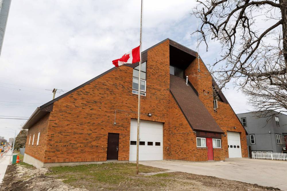 Flags fly at half-mast in front of Winnipeg Fire Paramedic Service Station 3 at 337 Des Meurons Street, Monday.