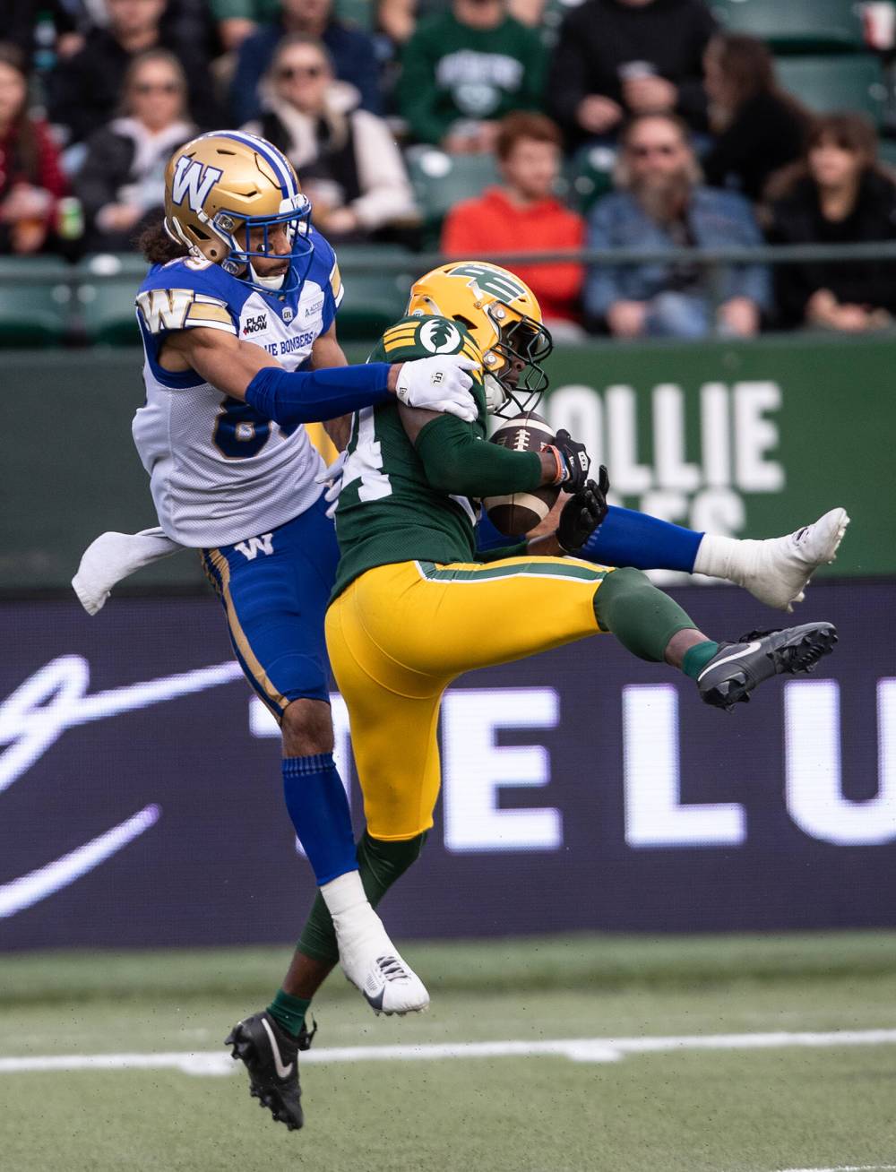 Winnipeg Blue Bombers' Kenny Lawler (left) tries to stop Edmonton’s Darrius Bratton from making an interception.