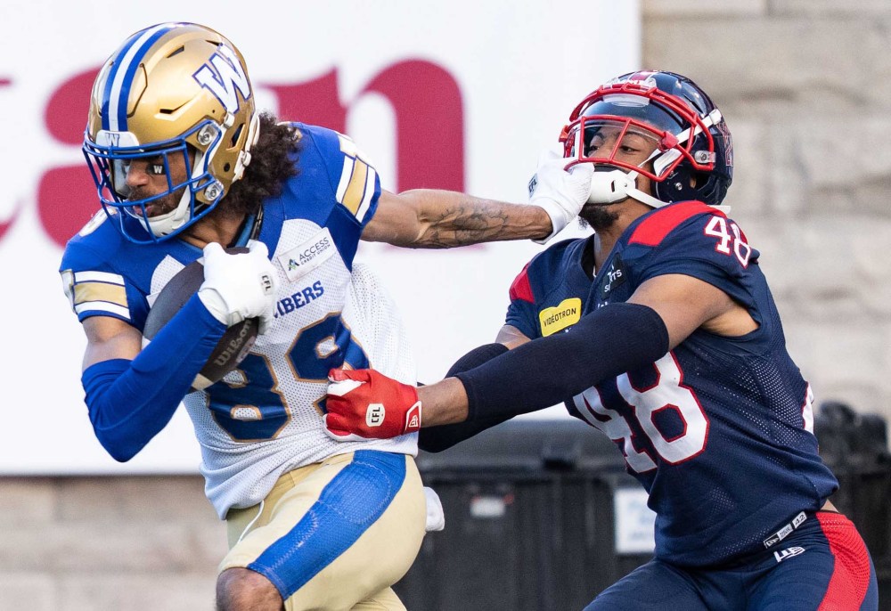 Winnipeg wide receiver Kenny Lawler tries to get past Alouettes defensive back Kabion Ento during the second half of the game in Montreal on Saturday.